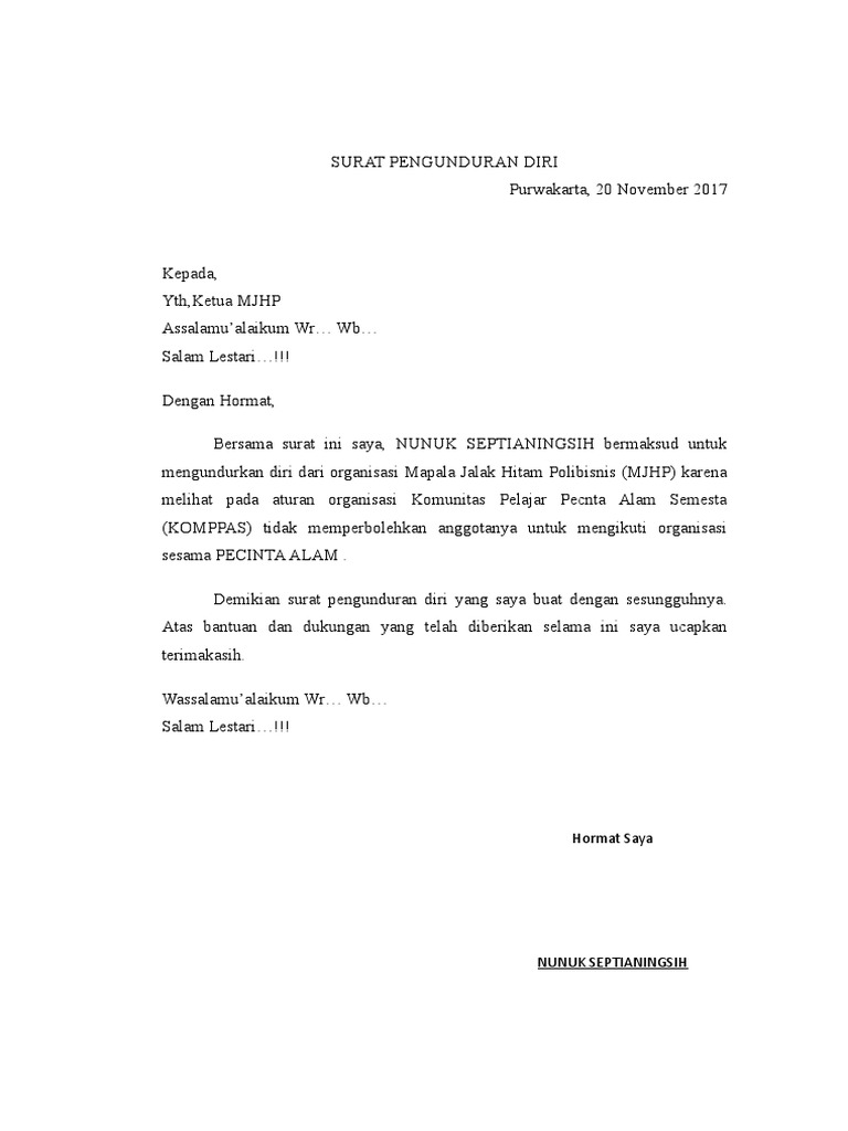 Nah, untuk melanjutkan bagaimana sistem ketika anda keluar dari pekerjaan? Jika itu terjadi, anda harus membuat surat pengunduran diri. Bertujuan untuk mengajukan surat pengunduran diri kerja dari pt. Mengundurkan diri dari sebuah organisasi adalah sebuah keputusan yang sangat besar dan untuk merealisasikan keputusan yang sudah dibuat tentu kita harus membuat surat pengunduran diri yang baik. Surat pengunduran diri atau surat resign dari organisasi merupakan sebuah surat resmi yang di dalamnya menyatakan bahwa seseorang yang bersangkutan bermaksud untuk mengunduran diri dari organisasi tertentu. Jika kamu merasa ingin mengundurkan diri dari pekerjaan kamu saat ini, maka tidak ada salahnya untuk belajar membuat surat pengunduran diri. Berikut beberapa contoh surat pengunduran diri atau surat resign dengan penulisan yang benar dan sopan, dilengkapi dengan trik dan tips pembuatannya. Sebagai anggota badan eksekutif mahasiswa di universitas sragen saya yang bertanda tangan di bawah ini mengajukan permohonan izin untuk mengundurkan diri dari organisasi kepramukaan di sma negeri 2 jenang. Berikut contoh surat pengunduran diri dari organisasi yang baik contoh surat pengunduran diri dari jabatan. Dalam artikel kali ini akan dibahas mengenai surat pengunduran diri dari organisasi paling lengkap. Di sini, kamu bisa mempelajari berbagai contoh surat pengunduran diri yang baik disertai dengan format susunan serta tips untuk membuatnya. Kotakpintar contoh surat pengunduran diri yang baik dan benar. Mengundurkan diri dari sebuah pekerjaan bisa menjadi hal yang sensitif, sehingga anda harus menyampaikannya dengan benar.